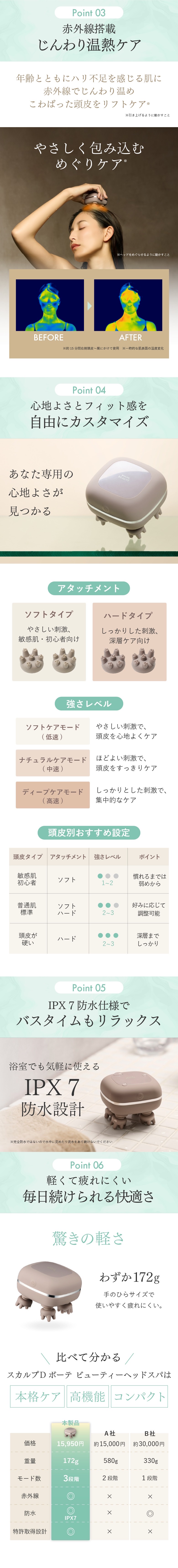 スパ体験しているかのようなリラックス感を味わいながら、「やわらぎケア」、「温熱ケア」、「頭髪洗浄ケア」の3つのケアで、本来の弾むような髪と顔つきを呼び覚ます。