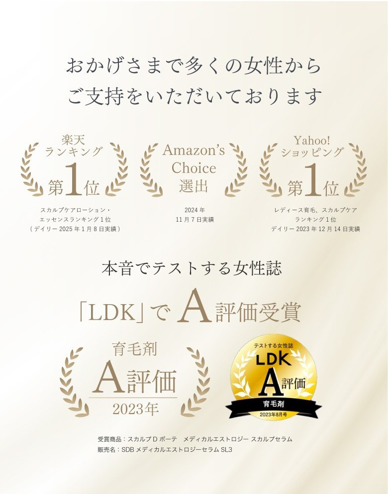 本音でテストする女性誌「LDK」で育毛剤部門A評価を受賞。